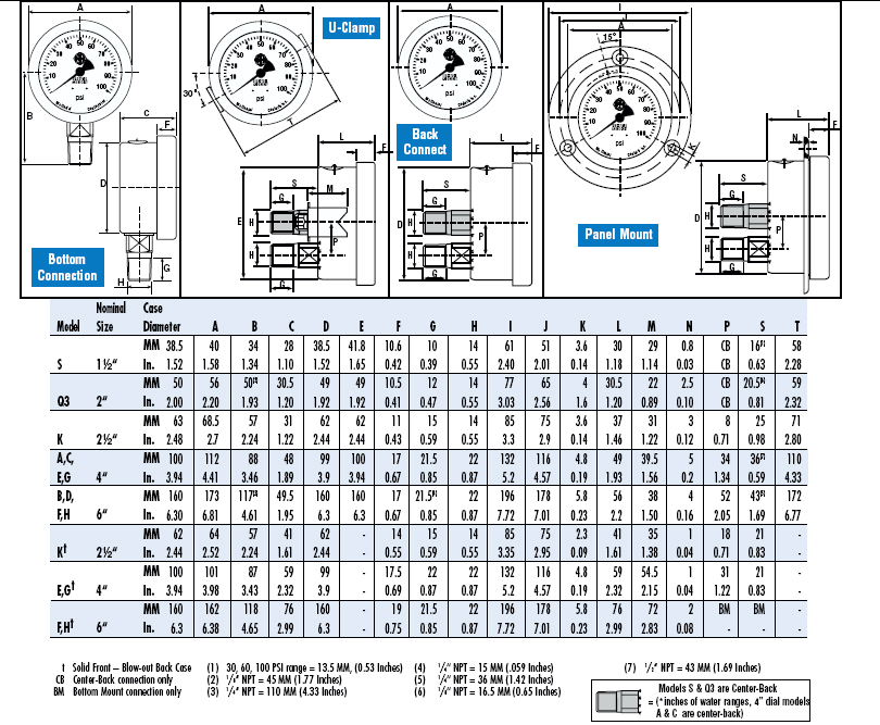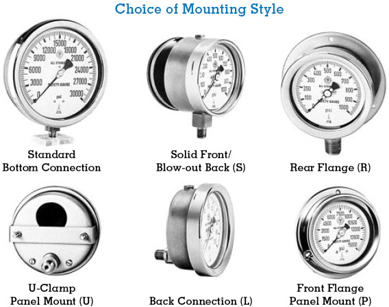 B = psi/Bar(dual scale) K = psi/kPa(dual scale) O = O?(cleaned for oxygen service) S = Solid front/blow-out back (2?", 4” & 6” gauges only) |