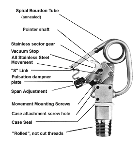 The best-known construction materials available are used in the manufacture of McDaniel gauges. A. 304 Stainless Steel Heavy Duty Case B. 316 Stainless Steel Heavy Duty Movement C. 316 Stainless Steel Heavy Duty Connection, Socket and Bourdon Tube D. Neoprene Gaskets E. Laminated Safety Glass Lens F. Polished 304 Stainless Steel Bayonet Ring G. Stainless Steel Blowout Assembly |